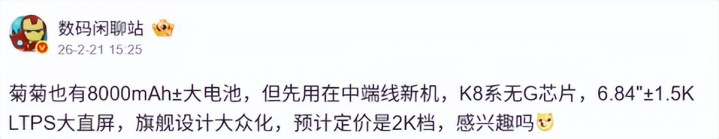 近期有博主爆料表示,华为正在开发一款内置8000mAh±大电池的新机,采用旗舰级别的设计,而且价格会非常亲民。
